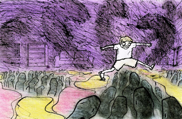 انزلقت أفعى أخرى بصمت لتجاور الأولى، ورفعت رأسها، ليصبح هناك رأسين مرفوعين الآن، وزوجين من العيون يحدقان في القدم، ويصوبان النظر نحو بثعة صغيرة عارية أسفل إبزيم الصندل مباشرة حيث يبرز الجلد للعيان. ارتفع الطفل عالياً على أطراف أصابعه وبقي هناك متجمداً من الرعب. انقضت دقائق قبل أن يجرؤ على الحراك مجدداً.